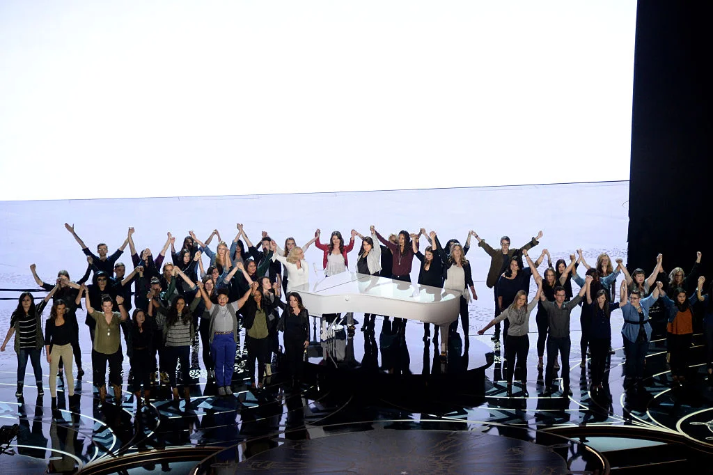 Kamilah Willingham with Diane Warren, Lady Gaga, and The Hunting Ground director Kirby Dick following a special performance of "Til It Happens to You"